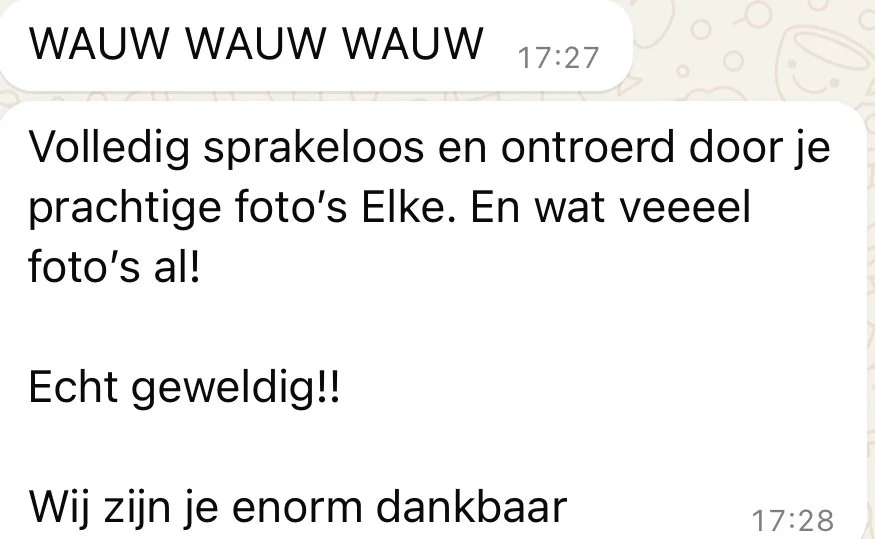 “Waar Elke bovenal in uitblinkt is het vastleggen van de spontane (niet geposeerde) momenten waardoor je verrast wordt door natuurlijke foto’s waar je het bestaan niet van afweet. Geweldig!”